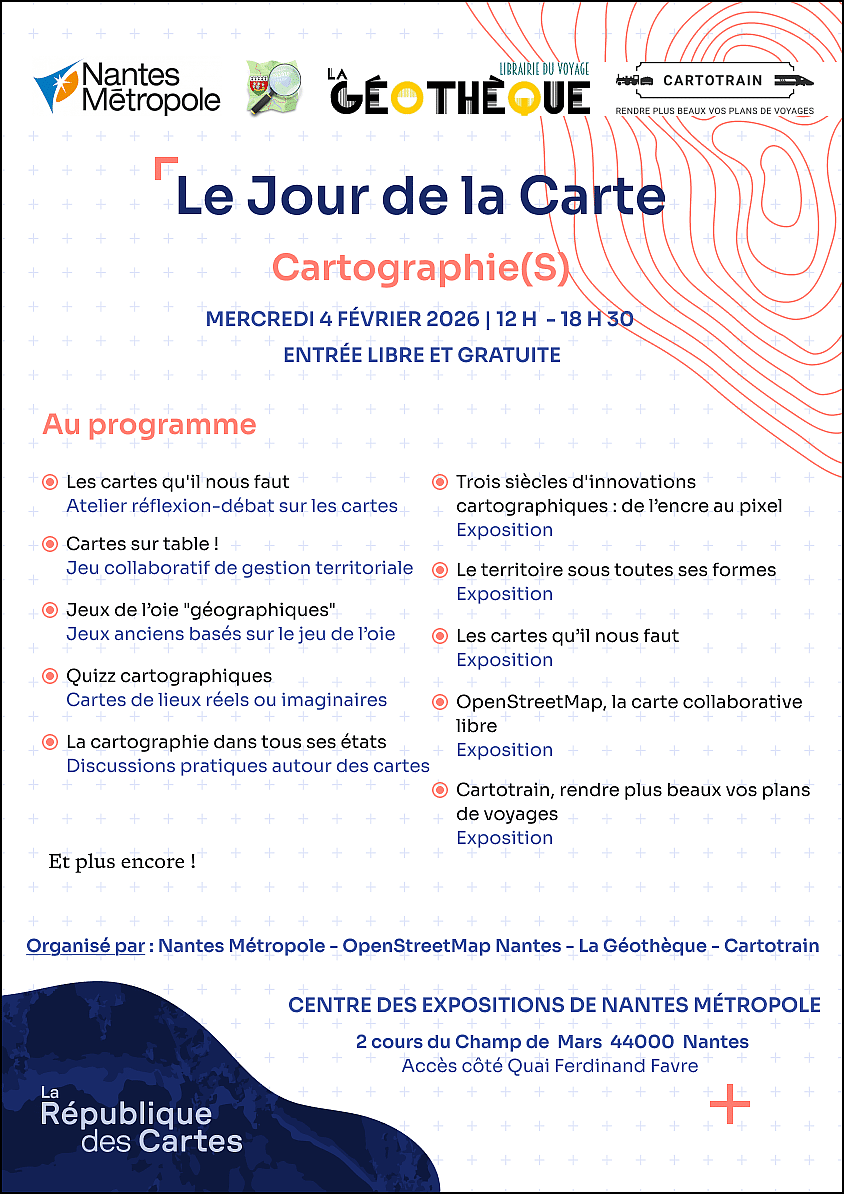 Nous, acteurs·trices de la cartographie et passionné·e·s des cartes, vous donnons rendez-vous à « Cartographie(S) », l'événement nantais du « Jour de la Carte ».